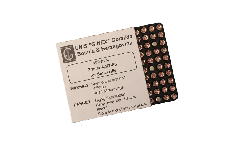 GINEX Primer 4,5/3-P3 för Small Rifle är en tändhatt designad för smågevärspatroner. Den erbjuder pålitlig och konsekvent prestanda, vilket gör den idealisk för både kommersiell användning och hobbyister. Varje förpackning innehåller 100 tändhattar och produkten är perfekt för omladdning av ammunition, med hög säkerhet och effektivitet. 4o mini