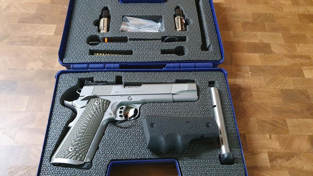 Medföljer originalväska med tillbehör, 2 st magasin, extra gummigrepp.