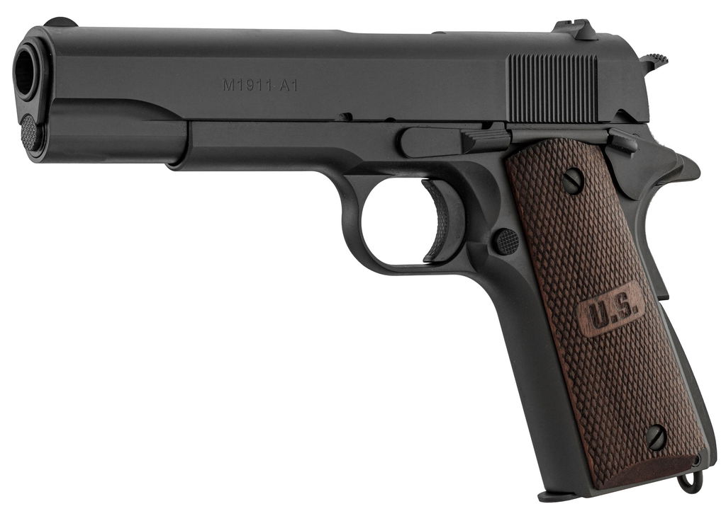 The classic 1911 pistol as A1 model in cal. .45ACP (M1911 A1) or 9x19mm (M1 A1) barrel lengths 5“ (127mm) or 4.25” (109mm), version with dust cover. One-sided thumb safety on the left and Grip safety. The pistol is available in Cerakote black coated or parkerized . All parts made of hammerforged steel. Screwed grip panels in wood with U.S. logo. Forged hammer, A1 sights, full trigger and loop underline the originality of this special model. The barrel design is classic with bushing. Included in delivery are gun case, manual, 2 magazines 8rds (9rds for 9x19mm)